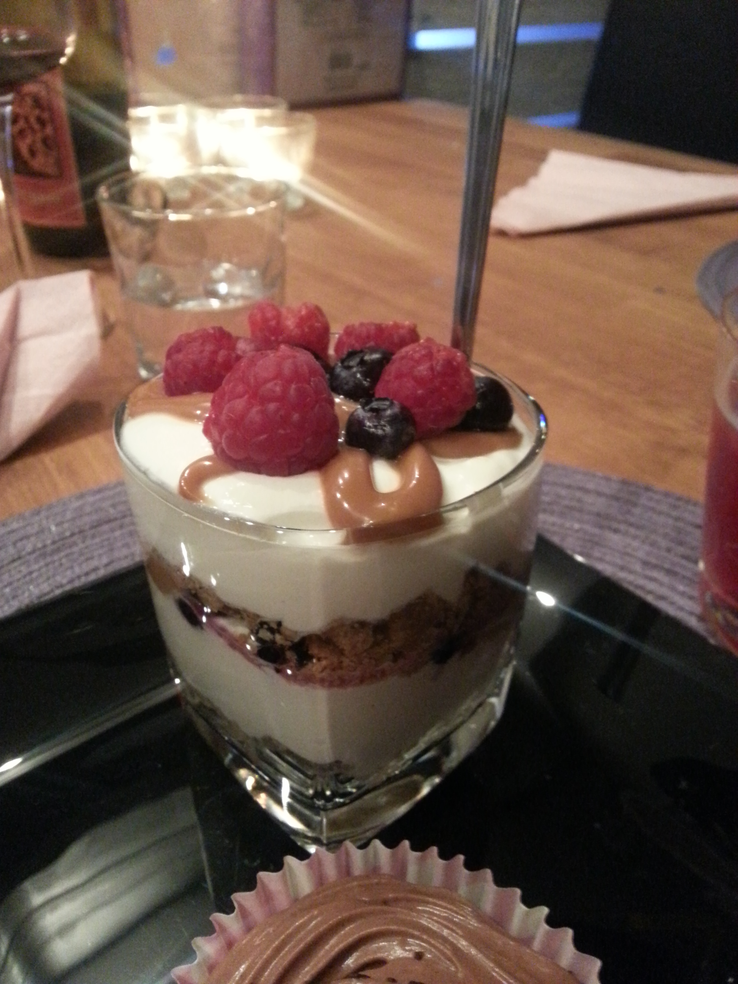 Förbered den kondenserade mjölken dagen innan genom att koka till kolasås. Lägg den i botten på en kastrull och täck med vatten. Jag brukar ta en kastrull som jag inte är alltför rädd om då klistret från burken kan fastna längs kanten. Koka i ca 3 h och se till att burken alltid är täckt med vatten. Ta sedan upp burken och låt svalna, förvara i kylskåp över natten. Skulle ni stå i ren panik samma dag som gästerna kommer så funkar en helt vanlig köpt kolasås på tub. Inför servering: Vispa upp grädden och blanda till en jämn och fluffig smet tillsammans med matyoghurten. Smaka av med vaniljsocker, beroende på hur söt ni vill ha desserten. Varva sedan smulade havrekakor, yoghurt, blåbär och kolasås i ett snyggt glas. Avsluta med yoghurten och toppa med kolasås och färska hallon & blåbär. Så gott och himla enkelt! Observera att kolasåsen Inte ska ta slut på fyra glas – om ni nu inte önskar en riktig kolabomb.