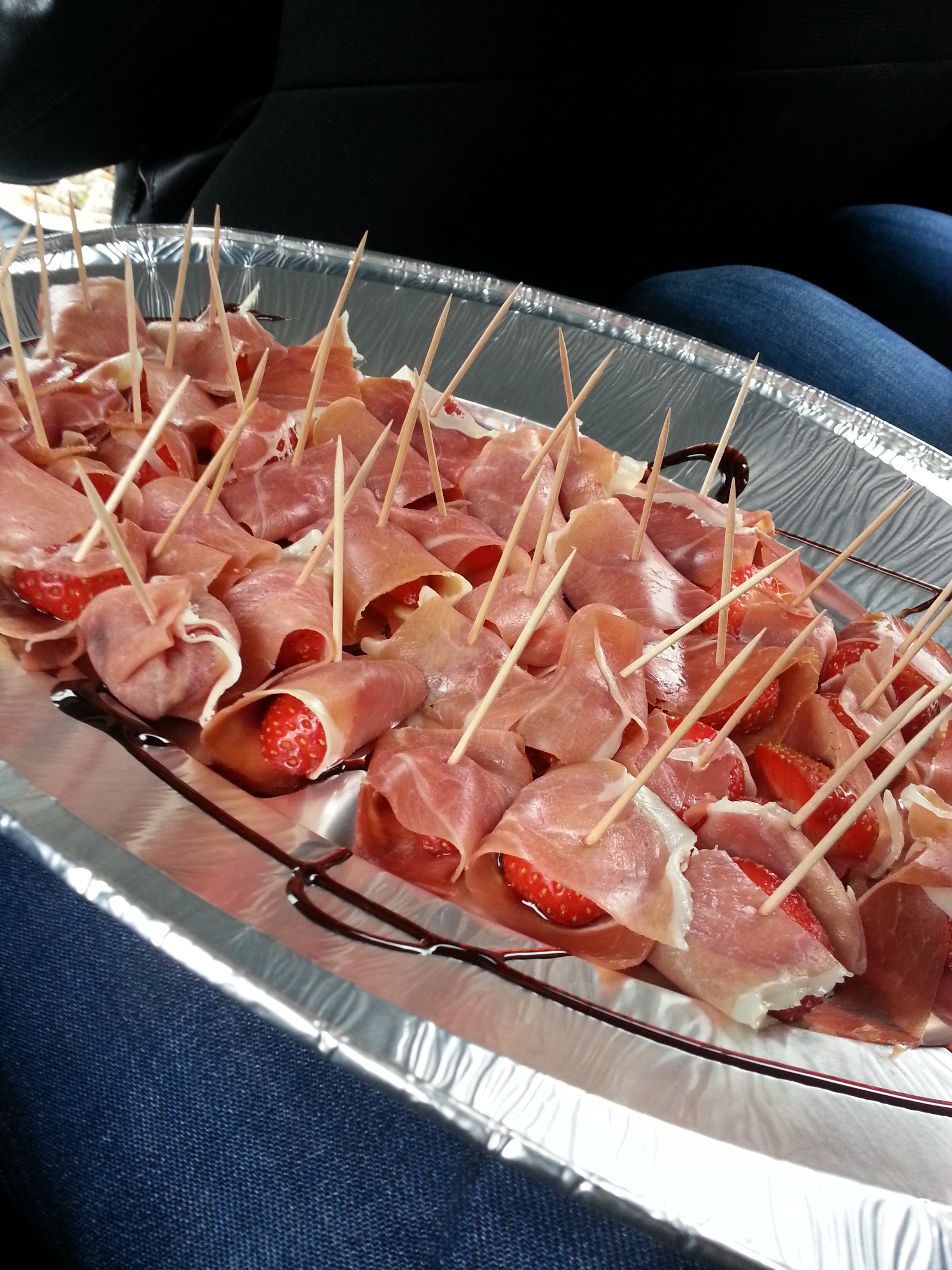I helgen som var fick vi i uppgift att ta med oss snittar till kräftskivan. De blev tre olika sorter som alla gick åt i ett nafs. Serranolindade jordgubbar med balsamico, kanape med kalkon & baconröra och havrekaka med kantarellröra.