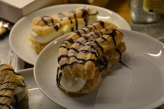 Tydligen så dög petit choux-smeten för dekorerad och klar blev bananskapelsen ganska vacker, om jag får säga det själv 😉 Blev ändå lite besviken för att chouxerna inte fluffade upp sig så högt, men det var troligtvis för att jag spritsade ”bananerna” för tunt. Hur som, här kommer receptet för er som vill lyxfluffa i veckan eller nästa helg – smeten räcker till 10 bakelser och går väldigt fort att göra!